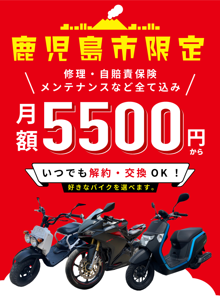 ※初月のみ、排気量に応じた事務手数料(1ヶ月分)を頂きます。